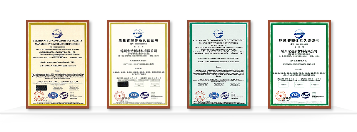 Jinzhou Hongda New Material Co., Ltd., founded in 1993, is a professional manufacturer of ferroalloy powder, located in the famous "Corridor of West Liaoning" in Jinzhou City, Liaoning Province, adjacent to Jinzhoubei Railway Station, and enjoys superior geographical position, with convenience of road, railway, and sea transportation. The company has passed ISO9001:2015 Quality Management System Certification and ISO14001:2015 Environmental Management System Certification. It is a "high-tech enterprise" and "Specialized, Refinement, Differential and Innovative enterprise" of Liaoning Province. The company has been awarded the honorable title of "Contract-abiding and Creditworthy" enterprise by the State Administration for Market Supervision and "A-level Tax-Paying Credit Enterprise" by State Administration of Taxation Jinzhou Taxation Bureau for years in a row. It is the designated production enterprise of welding rod accessories designated by the Welding Material Branch of China Electrical Equipment Industry Association and China Welding Materials Professional Committee. The main products of our company include Chromium Metal, Electrolytic Manganese Metal, Nickel Powder, Ferro Molybdenum, Ferro Vanadium, Ferro Niobium, Ferro Tungsten, High (Micro) Carbon Ferro Chrome, Chromium Carbide, Silicon-Manganese, High (Medium and Low) Carbon Ferro Manganese, Ferro Titanium, Ferro Boron and other special metal powder, widely used in welding rod, welding wire, 3D printing, powder metallurgy, hard alloy, ceramics, aluminum addition and new energy batteries and other industries. The company is committed to building a top enterprise in the field of ferroalloy powder with stable product quality, warm and thoughtful after-sales service as well as honest and reliable customer reputation. At present, Jinzhou Hongda New Material has established long-term and stable cooperative relationships with more than 100 domestic and overseas industry leading enterprises, and our products are exported to Europe, America and Southeast Asia and many other countries, which enjoy a good reputation from customers. The company has always been adhering to the development concept of "Integrity-based, customer first", bearing in mind the mission and task of a century-old enterprise, integrating our own development into the torrent of the times, and resonating with China's economy and strong military. We are going to adhere to independent research and innovative development, carry out in-depth cooperation with domestic universities in the new development stage, actively play a key role in ensuring stable and reliable industrial chains in welding and powder metallurgy industries, to contribute to the development of customers with a broader vision and a more grand pattern, jointly pursue high-quality development of both enterprises.